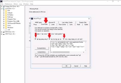 WinHTTrack window appears, click the Scan Rules tab and select the check boxes for the file types as shown in the screenshot, then click OK