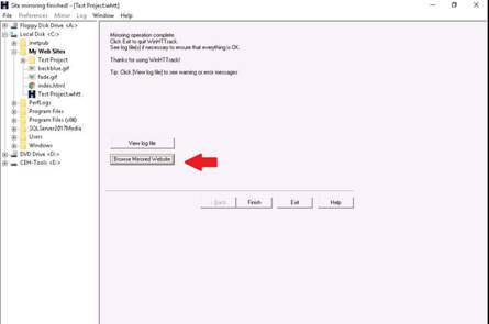 WinHTTrack displays the message Mirroring operation complete once the site mirroring is completed. Click Browse Mirrored Website.