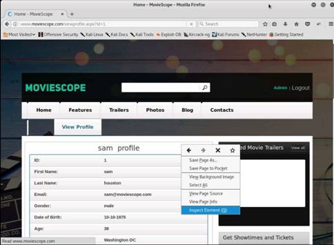 The mirrored website for www.moviescope.com is shown in the browser. (Your target site will show.) The URL displayed in the address bar indicates that the website's image is stored on the local machine.