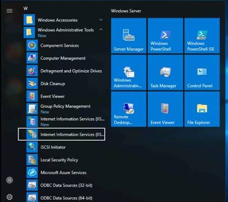 Launch Start menu by hovering the mouse cursor over the lower-left corner of the desktop. Scroll down for Windows Administrative Tools folder. Click Internet Information Services (IIS) Manager application to launch IIS Manager.