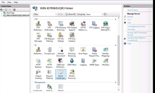 The Internet Information Services (IIS) Manager window appears; click the Machine name in the Connections pane, and double-click Server Certificates under IIS category.