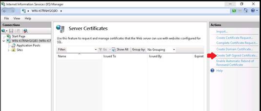 In the Server Certificates wizard, click Create Self-Signed Certificate in the Actions pane (right-side).