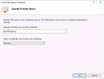 The Create Self-Signed Certificate wizard appears; type a name in the Specify a friendly name for the certificate field.