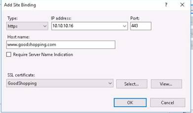 Choose the IP address in which the site is hosted, or leave the default setting. Specify the Host name www.example.com. In this lab, we are applying certificate for the Goodshopping site.