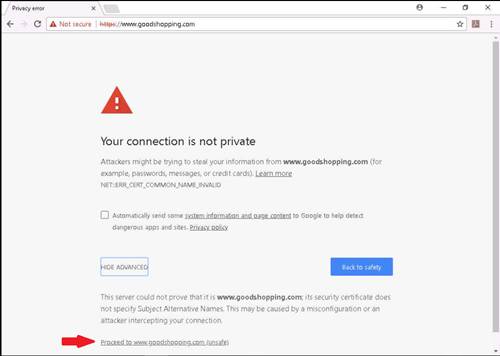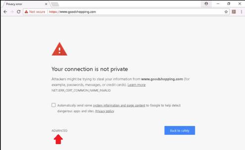 Open a browser (here, chrome), type https://www.goodshopping.com in the address bar, and press Enter. As we are using an https channel to browse, it displays a page stating that the connection is not private; click ADVANCED to proceed.