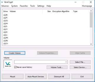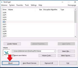 The window closes and you are returned to the VeraCrypt window. Click Mount.