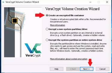 VeraCrypt Volume Creation Wizard window appears, select Create an encrypted file container to create a virtual encrypted disk within a file.