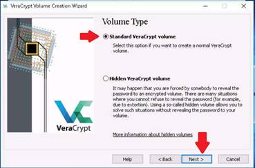 In the Volume Type wizard, select Standard VeraCrypt volume. This creates a normal VeraCrypt volume.