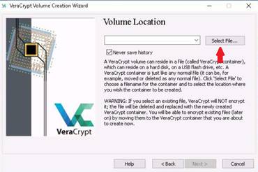 After saving the file, the location of file containing the VeraCrypt volume is set; click Next