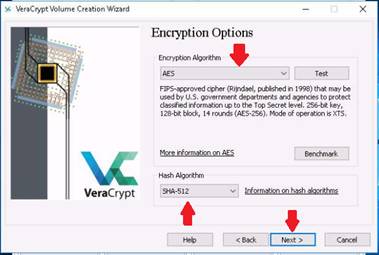 In the Encryption Options wizard, select the AES Encryption Algorithm and SHA-512 Hash Algorithm, and click Next.