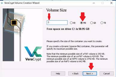 In the Volume Size wizard, specify the size of the VeraCrypt container as 2 megabyte, and click Next.