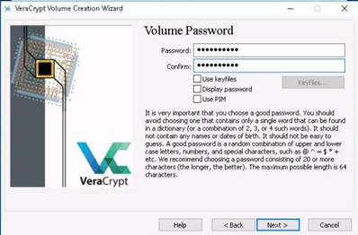 The Volume Password wizard appears; provide a good password in the Password field, retype it in the Confirm field, and click Next. In this lab, the password used is qwerty@123.