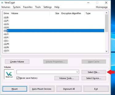 The VeraCrypt main window appears; select a drive (here, I:), and click Select File….
