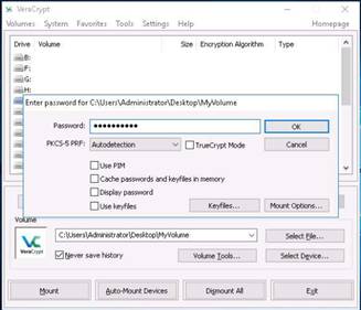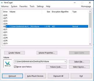 INFO: This lab is used to demonstrate that, in cases of system hacks, if an attacker manages to gain remote access or complete access to the machine, he/she cannot find the encrypted volume-including its files-unless he/she is able to obtain the password. Thus, all sensitive information located on the encrypted volume is safeguarded.
