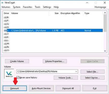 Switch to VeraCrypt window, click Dismount and then click Exit.